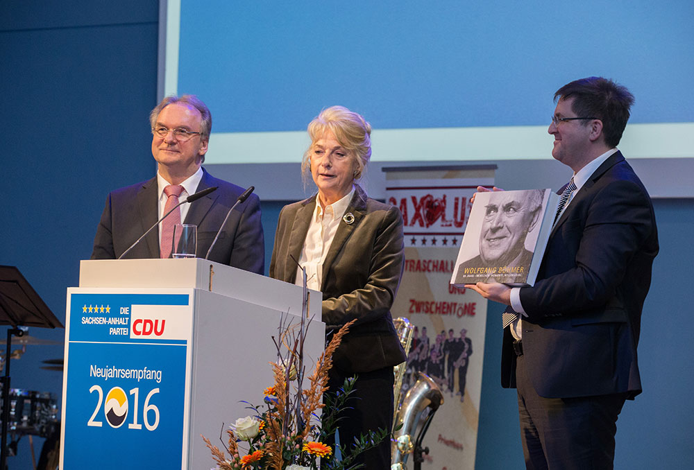 Zu Beginn des Neujahrsempfangs übergab Ministerpräsident Haseloff zusammen mit Böhmers damaliger Regierungssprecherin Frau Dr. Berger ein Buch mit Beiträgen über das Leben und Wirken von Prof. Böhmer. Zahlreiche Autoren haben hier über Begegnungen und Ereignisse geschrieben, welche in diesem aufwendigen Unikat zusammen gefasst wurden. Haseloff lobt das Wirken seines Amtsvorgängers und dankte ihm für seine Bemühungen für unser Heimatland Sachsen-Anhalt.